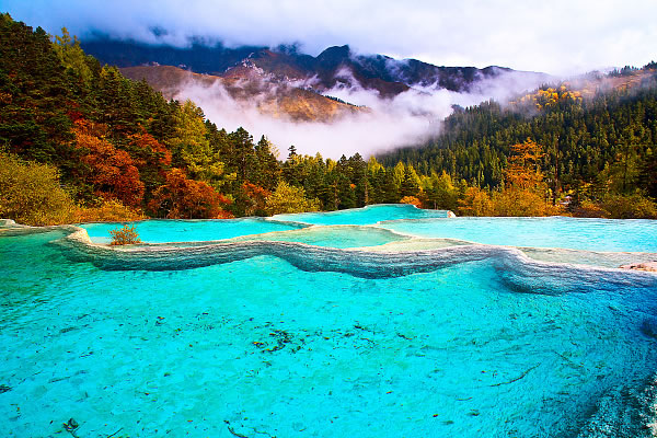 黃龍風(fēng)景名勝區(qū)面積700平方千米,與九寨溝相距100千米,海拔1700~5588米。核心區(qū)域點綴著三千多個彩池。以結(jié)構(gòu)奇巧、色彩豐艷的地表鈣華景觀為主景,由黃龍溝、丹云峽、牟尼溝、雪寶鼎、紅軍長征紀(jì)念碑碑園等組成。主要景觀集中于長約3.6公里的黃龍溝,溝內(nèi)遍布碳酸鈣華沉積,并擁有豐富的動植物資源。