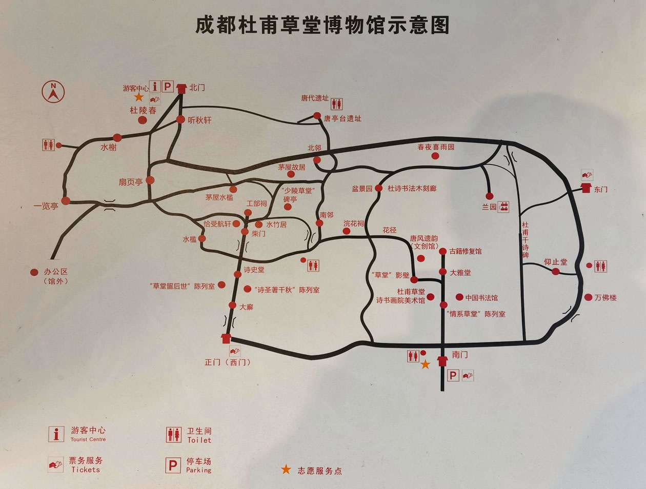 成都杜甫草堂博物館核心文物區(qū)內(nèi),有照壁、正門、大廨、詩史堂、柴門、工部祠等景點(diǎn)。