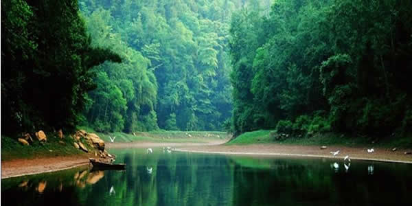 (4)象鼻河 象鼻河位于回龍湖尾段,經(jīng)岳池縣城出發(fā)車行至天平鎮(zhèn)回龍湖坐船可到,河長約四公里。因河端有一小山,形態(tài)奇特,遠望酷似大象的鼻子,所以這條河就叫象鼻河。象鼻河寬五六丈,象一顆長寶石鑲嵌在兩岸的高巖之間。象鼻河西側(cè)有雞頸坳和庵堂坡相互攀比,各自把山巖泉水盡量拋出。飛瀑直下,銀花四濺,疑是仙人,丟下白練。兩岸樹木,青翠欲滴,藤繞山石,鳥戲其間,蜂飛蝶舞,何等悠然。乘舟慢進,有山風習習,涼爽撲面。清澈河水,擁抱船板,發(fā)出咕咕細語,情意綿綿。上游涌來清流,與河水交融,握手言歡。游魚競技,爭先恐后,其樂融融,游人贊嘆。“青山之中藏小河,木船水頭蕩清波。有人興起一聲吼,魚逃鳥飛野兔躲。誰說人間無仙境?不信請來象鼻河。”象鼻河匯入的回龍湖鑲嵌在兩岸直壁芳草如茵的群山之中,這里水面遼闊,一碧如玉;湖上輕舟飛蕩,魚歌陣陣,銀鱗競躍,水鳥爭翔,陰雨時山色空 蒙,晴天里滿目蒼翠,是川東的又一西子湖。湖邊近500畝的名優(yōu)水果和各種反季節(jié)果類,更是錦上添花。
