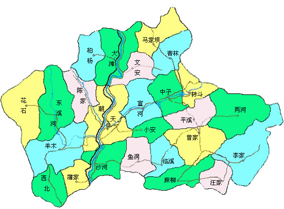 朝天區(qū)轄6個(gè)鎮(zhèn)、19個(gè)鄉(xiāng):朝天鎮(zhèn)、大灘鎮(zhèn)、羊木鎮(zhèn)、曾家鎮(zhèn)、中子鎮(zhèn)、沙河鎮(zhèn)、陳家鄉(xiāng)、小安鄉(xiāng)、魚洞鄉(xiāng)、東溪河鄉(xiāng)、花石鄉(xiāng)、蒲家鄉(xiāng)、西北鄉(xiāng)、宣河鄉(xiāng)、轉(zhuǎn)斗鄉(xiāng)、青林鄉(xiāng)、平溪鄉(xiāng)、兩河口鄉(xiāng)、李家鄉(xiāng)、汪家鄉(xiāng)、麻柳鄉(xiāng)、臨溪鄉(xiāng)、文安鄉(xiāng)、馬家壩鄉(xiāng)、柏楊鄉(xiāng)。