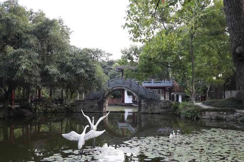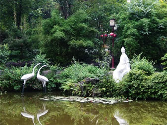 過蓮池旁的“山谷小憩”,亦為園中一景。其間,黃庭堅(jiān)身著便裝,手拿書卷,在池旁靜坐沉思。兩只白鶴立于水中相伴,此景也稱“雙鶴伴涪翁”,優(yōu)雅清新,寓味深長,形象地表現(xiàn)了黃庭堅(jiān)在謫居戎州時(shí),平和豁達(dá)的心態(tài)。