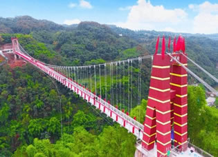 七洞溝9D云海玻璃橋橫騎南屏山山脈與佛來山山脈峽谷之上,全長386米,寬3.3米,垂直落差188米,在中國西南部地區(qū)長、寬、高都名列第一,是長寧旅游大發(fā)展靚麗新畫卷之一。玻璃橋采用最新9D技術(shù),以仿真場景與感應(yīng)設(shè)置模擬多種特殊效果、立體畫面,將視覺、聽覺、觸覺和動感完美地融為一體,給游客帶來驚心動魄的刺激感受。走在橋上,不僅可以俯瞰綿溪河,還可以飽覽南屏山脈、佛來山脈等2座群山的英姿;晴天時,藍天和白云的倒影鋪滿天橋,讓人在對透明的腳下戰(zhàn)戰(zhàn)兢兢之余,更樂享于踏云而行的快感;而云霧天氣時,玻璃橋則在霧中若隱若現(xiàn),天上人間的美景更是讓人驚嘆不已。