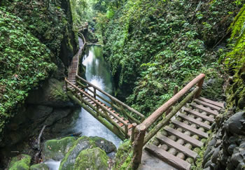 五龍溝古稱蠻河溝,長約8千米,因傳說古時(shí)有五條神龍隱藏于溝中而得名。其中的景色有金娃娃沱,景色絕佳的龍隱峽棧道,石筍巖,回音壁等。