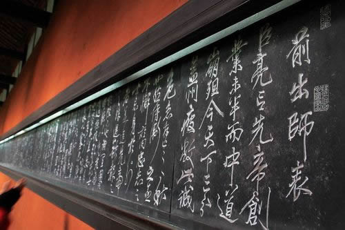 諸葛亮殿的東西廂是書屋、客室,鐘樓、鼓樓峙立大殿二角。諸葛亮殿內(nèi)供祀著諸葛亮的貼金泥塑坐像,左側(cè)是諸葛亮之子諸葛瞻,右側(cè)是諸葛亮的孫子諸葛尚。塑像前有銅鼓三面,鑄于公元六世紀之前,傳說是南征夷蠻時所用。大殿后壁嵌有許多石刻,東壁是當(dāng)代書法家沈尹默書寫的諸葛亮 《隆中對》 ,表達的是“三顧頻繁天下計,兩朝開濟老臣心”的壯志雄心;西壁則是宋代名將、“精忠報國”的民族英雄岳飛所書的諸葛亮 《出師表》 ,“鞠躬盡瘁,死而后已”名句傳誦千古,忠誠執(zhí)著的浩然正氣氣貫長虹。殿內(nèi)外匾對甚多,都是對諸葛亮的謳歌和追思。