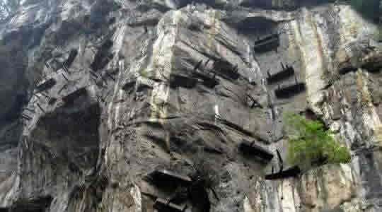 珙縣洛表麻塘壩和蘇麻灣是僰人懸棺最集中的地方,僅在縱深四千米長(zhǎng)的麻塘壩懸崖絕壁上,現(xiàn)存上萬(wàn)個(gè)棺樁棺孔;數(shù)百具懸棺,是世界上懸棺分布最集中,保存最完好,數(shù)量最多的地區(qū),被譽(yù)為“世界一絕”、“天然懸棺葬的博物館”。其悠久的歷史,神奇的傳說(shuō),神秘的文化,獨(dú)特的葬式,耐人尋味,千古難解。同時(shí),隨棺而作的數(shù)百幅巖畫(huà),色彩鮮艷,栩栩如生;形象地再現(xiàn)了僰人時(shí)代的自然環(huán)境、社會(huì)生產(chǎn)、民風(fēng)民俗、宗教信仰,令人折服。入口處的“九盞燈”,因傳說(shuō)三根橫木上共放有九盞“長(zhǎng)命燈”而得名,它前有點(diǎn)將臺(tái);右有石船。形如斧砍的石灰?guī)r絕壁上,分布了二十四具懸棺、六十二幅巖畫(huà)。懸棺神奇絕妙,府瞰萬(wàn)眾;巖畫(huà)題材廣泛,內(nèi)容豐富,牽馬放牧,垂鉤釣魚(yú)、舞蹈、球戲、踢鍵娛樂(lè)。雖然構(gòu)圖簡(jiǎn)練,線條粗獷,卻富有濃郁的生活氣息和鮮明的民族風(fēng)格。而最遠(yuǎn),最高的當(dāng)數(shù)老鷹巖;14具懸棺懸置在110余米的峭壁上,為懸棺精華。而蘇麻灣山勢(shì)巍峨;奇巖崢嶸,河水澄澈清瑩,山光水色相映成趣,優(yōu)美迷人,在距水面50余米的懸崖峭壁上重重疊疊的放有50具懸棺,并留有大量樁孔,給人以奇異神秘的感受。另外,麻塘壩謝家灣,留有一民國(guó)建筑一何家大院,已有180多年的歷史,占地15畝,全為木質(zhì)結(jié)構(gòu),有三座院落,一個(gè)花園,二座石碉樓;雕刻精美,巧妙絕倫。