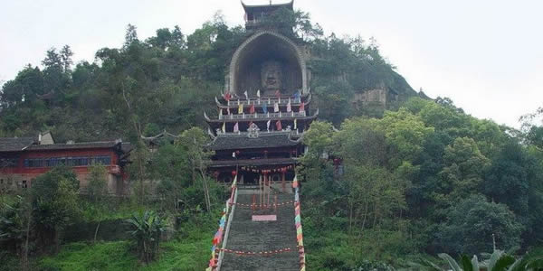 榮縣大佛:榮縣城東0.5公里有全國(guó)第二大佛——榮縣大佛,大佛寺內(nèi)半山之上,有一尊巍峨的石刻如來(lái)坐佛佛像,世稱榮縣大佛。大佛依山崖鑿成,通高36.67米,頭長(zhǎng)8.76米,肩寬12.67米,膝高12米,腳寬3.5米,其頭部長(zhǎng)8.76米,肩寬12.67米,腳寬3.5米。是一尊如來(lái)佛像,僅次于樂(lè)山彌勒大佛,為中國(guó)第二石刻大佛。 榮縣大佛開(kāi)鑿于北宋元豐八年(公元1085年),完工于公元1092年,歷時(shí)八年始完工。大佛的頭頂上方有一道石條卷拱護(hù)罩,上刻“大開(kāi)覺(jué)路”四字;崖頂上還有磚閣一座,遠(yuǎn)看像在戴在大佛頭頂上的寶冠!〈蠓痂徔掏旯ず,即修有殿宇保護(hù),根據(jù)《古今圖書(shū)集成》記載,時(shí)有“架殿十層,高四十七丈,闊十五丈”、“舊時(shí)寺門(mén)、抵今溪岸”?梢(jiàn)當(dāng)時(shí)的恢宏氣勢(shì),其后幾毀幾修,現(xiàn)存的殿宇為清代嘉慶、道光年間所建。1988年重建的大佛護(hù)身樓,是仿木仿古重檐歇山式建筑,既保護(hù)了大佛,又具游覽價(jià)值,逐層登樓近瞻佛容慈顏,從上到下盡觀大佛偉岸雄姿,鳥(niǎo)瞰榮城風(fēng)貌,眺望遠(yuǎn)山近巒。