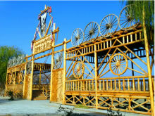 風格獨特、氣勢宏偉的大門就是刀郎人民俗村寨門。造型似刀郎人英雄男兒形象,體現刀郎人的勇敢彪悍、不屈不撓、勤勞智慧、熱愛子民的硬漢精神。
