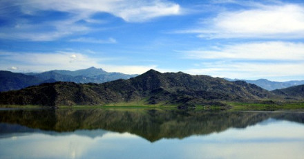 伊雷木湖位于額爾齊斯河與卡伊爾特河交匯處,湖面面積212.5平方千米,海拔1120米,蓄水1.13億立方米,水最深處約100米,從空中俯瞰呈巨大的"8"字形,是富蘊大地震斷裂帶上最大的堰塞湖。湖東西兩側(cè)雄峰屹立,南北兩側(cè)綠樹環(huán)繞,良田萬頃,村舍鑲嵌。湖面中央被東西兩座大山削去大半。