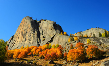 神鐘山,又名阿米爾薩拉峰,為一座如鐘似錐的花崗巖奇峰,在額河南岸平地拔起,海拔1608米,相對高差達365米,為阿爾泰山山景之最。巖壁縫上生長著白樺樹、青松和西伯利亞云杉。因巖體發(fā)育平行山坡面的同心圓層狀節(jié)理,受寒凍風化作用,沿平行坡面的節(jié)理不斷地拆離崩解垮塌,使山峰的表面既圓潤平滑,又十分陡峭,從而形成鐘狀地貌。