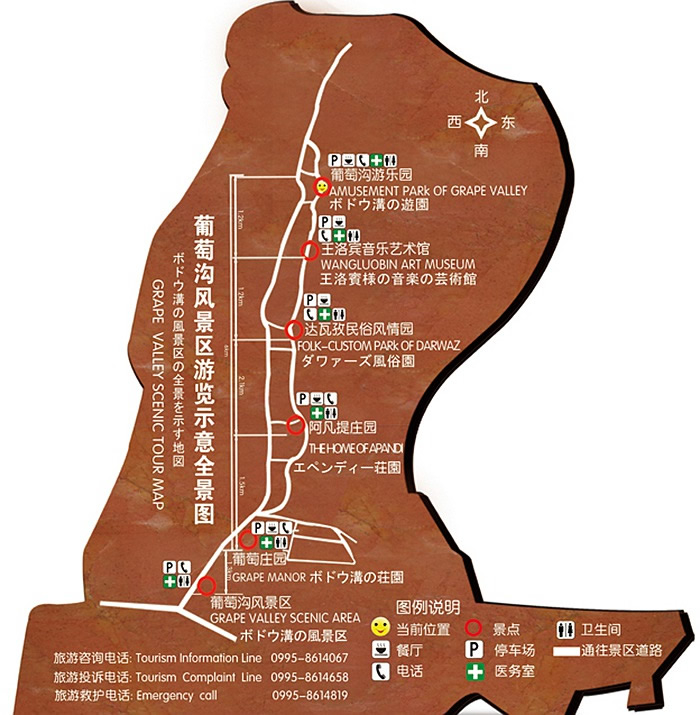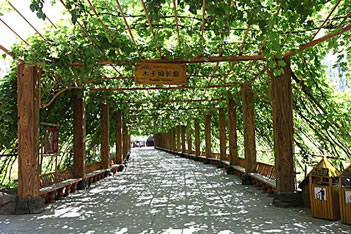 一是葡萄溝接待站。這是為中外賓客開辟的游覽場所,依山旁水,安靜、幽雅,景物天成,數(shù)條葡萄長廊深邃、幽靜,有的游客信步葡萄架下,仰首盡情觀嘗珍珠般的葡萄,有的游人坐在葡萄架下品嘗鮮葡萄。長廊盡頭碑石上葡萄溝三個鮮紅大字,格外引人注目,游人爭先恐后在此照相留念。園內(nèi)有民族風(fēng)味的食堂,有賣工藝品的蒙古包,還有劃船游玩的地方。