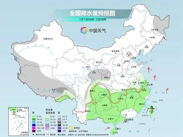 除了降溫,冷空氣還將帶來大范圍雨雪天氣。隨著冷空氣南下與暖濕氣流交匯,今天至2026年1月1日,中東部將現(xiàn)大范圍雨雪,陜西中南部、山西南部、河南西部、湖北西部部分高海拔地區(qū)有大雪或暴雪,最強(qiáng)降雪時(shí)段為2025年12月31日至2026年1月1日早晨。