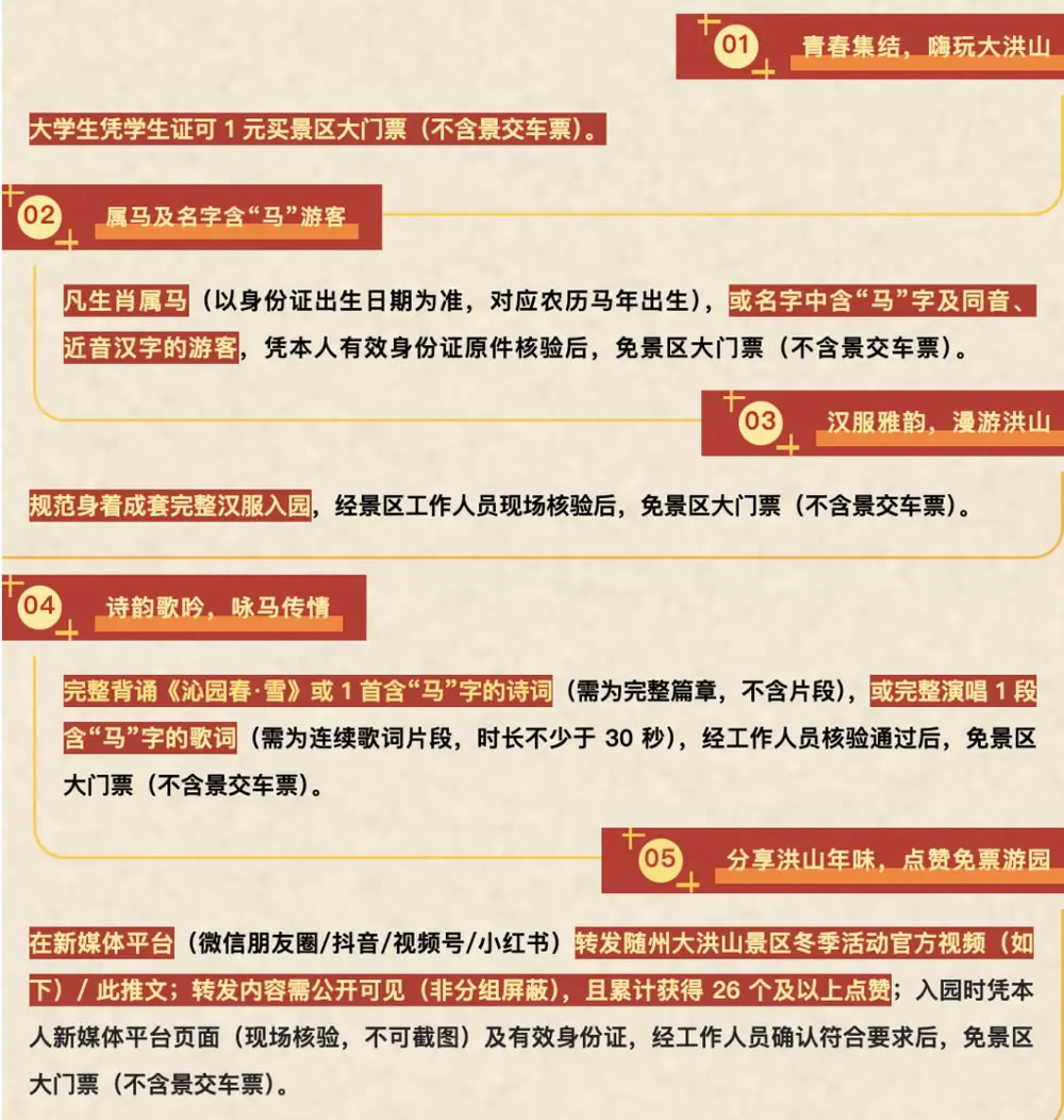 此外,隨州大洪山風(fēng)景名勝區(qū)發(fā)布的消息還顯示,規(guī)范身著成套完整漢服入園,經(jīng)景區(qū)工作人員現(xiàn)場核驗后,免景區(qū)大門票(不含景交車票);完整背誦《沁園春·雪》或 1 首含“馬”字的詩詞(需為完整篇章,不含片段),或完整演唱 1 段含“馬”字的歌詞(需為連續(xù)歌詞片段,時長不少于 30 秒),經(jīng)工作人員核驗通過后,免景區(qū)大門票(不含景交車票)。