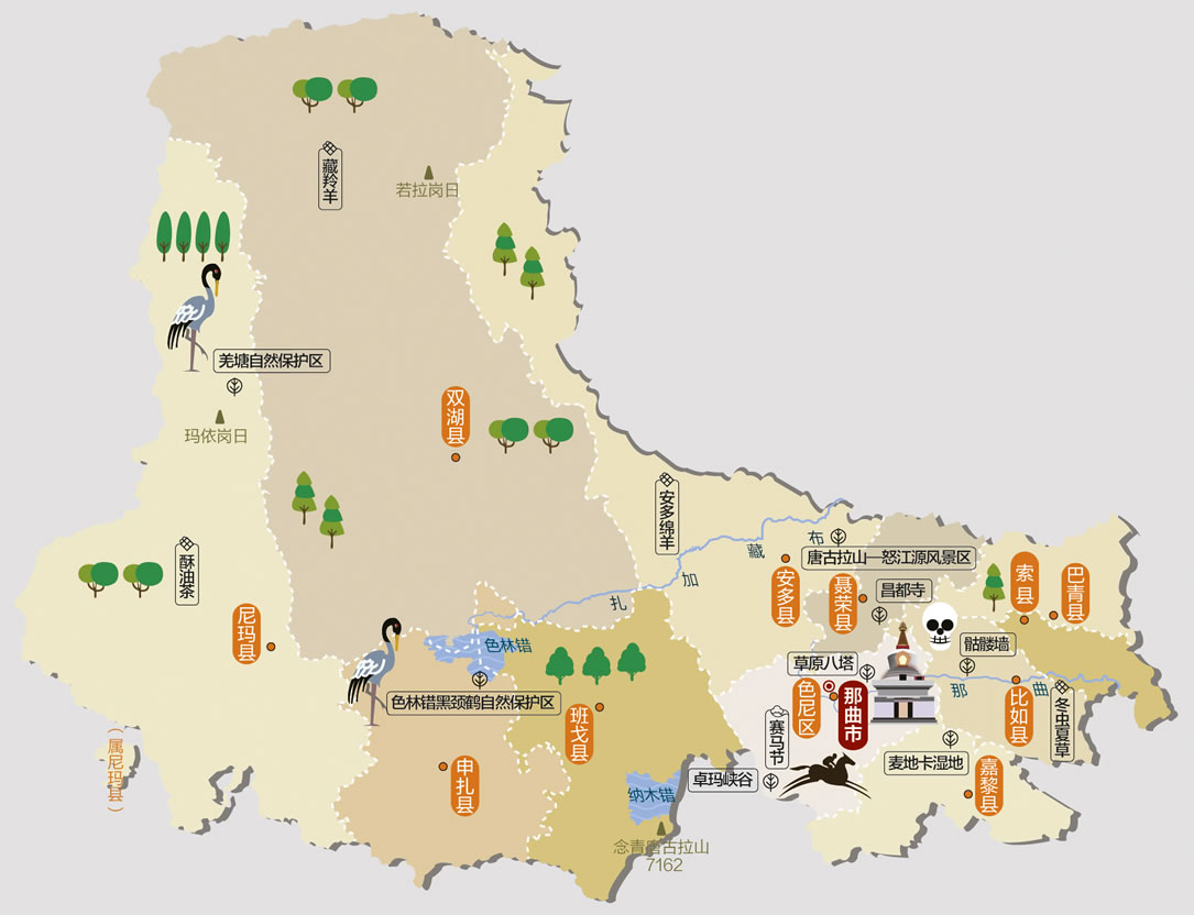 “那曲”因境內(nèi)那曲河(怒江上游)而得名,舊譯“黑河”,明末清初和碩特蒙古稱喀喇烏蘇,清代作哈拉烏蘇、喀拉烏蘇,為“那曲”這一藏語(yǔ)地名的滿語(yǔ)義譯。2017年10月,撤銷那曲地區(qū),設(shè)立地級(jí)那曲市。那曲市地理位置特殊,是西藏的“北大門”,市內(nèi)青藏鐵路、青藏公路、格拉輸油管線、蘭西拉光纜、青藏直流聯(lián)網(wǎng)等西藏的“生命線”,均貫穿那曲500多千米。境內(nèi)有國(guó)家級(jí)名勝風(fēng)景區(qū)納木錯(cuò)—念青唐古拉山、薩普冰川、國(guó)家級(jí)自然保護(hù)區(qū)麥迪卡濕地等自然風(fēng)光。是長(zhǎng)江、怒江、瀾滄江等大江大河的發(fā)源地,素有“江河源”“中華水塔”的美譽(yù)。