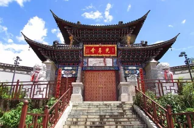 保山光尊寺,位于隆陽(yáng)區(qū)板橋鎮(zhèn)世科村后的五鳳朝陽(yáng)山。唐天寶二年(743年),南詔王皮邏閣為祭祀佛教尊神而建。座東朝西,依山形筑成七進(jìn)五院,計(jì)有建筑物23幢,占地面積9000余平方米。是古代保山典型的三教合一的寺廟,又是保山現(xiàn)存寺廟規(guī)模最大的建筑群。太平洋戰(zhàn)爭(zhēng)爆發(fā)時(shí)期,中國(guó)遠(yuǎn)征軍在此處設(shè)滇西抗戰(zhàn)指揮部。 2009年10月7日,光尊寺被列為第八批國(guó)家重點(diǎn)文物保護(hù)單位。