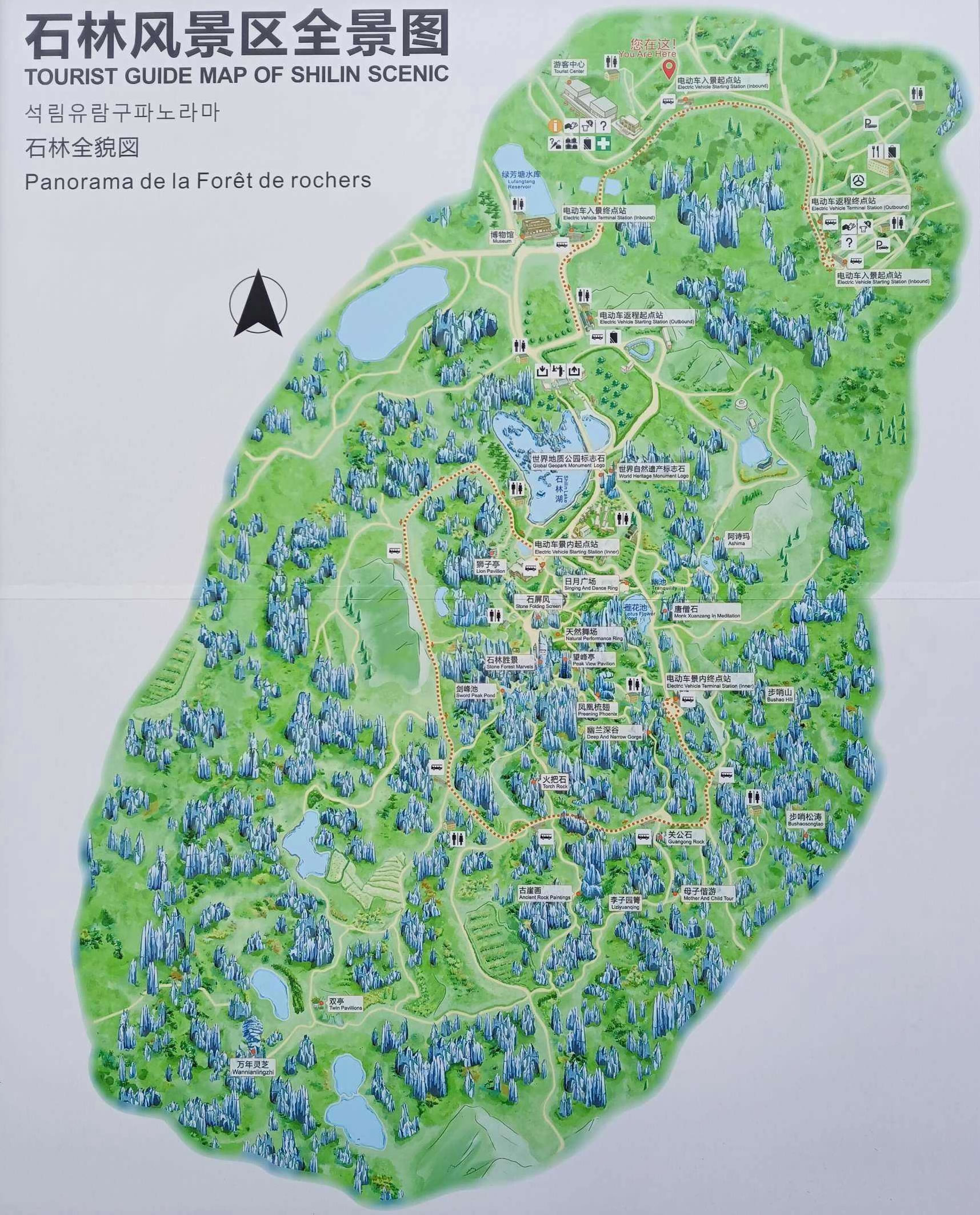 風(fēng)景區(qū)內(nèi)主要旅游景點:石林位于昆明市東,是世界罕風(fēng)的風(fēng)景名勝,是大自然鬼斧神工杰作。在路南廣達(dá)400平方公里的區(qū)域內(nèi),遍布著上百個黑色大森林一般的巨石群。有的獨立成景,有的縱橫交錯,連成一片,占地數(shù)十畝,上在畝不等。只見奇石拔地而起,參差崢嶸,千姿百態(tài),巧奪天工,被人們譽為“天下第一奇觀”。石林的主要游覽區(qū)李子箐石林,面積約12平方公里,游覽面積約1200畝。主要由石林湖、大石林、小石林和李子園幾個部分組成,游路5000多米,是石林景區(qū)內(nèi)單體最大,也是最集中、最美的一處。每年農(nóng)歷六月二十四日的火把節(jié),石林四周的彝、漢等各族群眾都要從四面八方匯集到石林歡慶佳節(jié)。人們在白天舉行摔跤、爬桿、斗牛等比賽活動,夜晚則燃起熊熊篝火,耍龍、舞獅、表演民族歌舞。阿細(xì)跳月、大三弦舞則是最受歡迎的傳統(tǒng)節(jié)日。