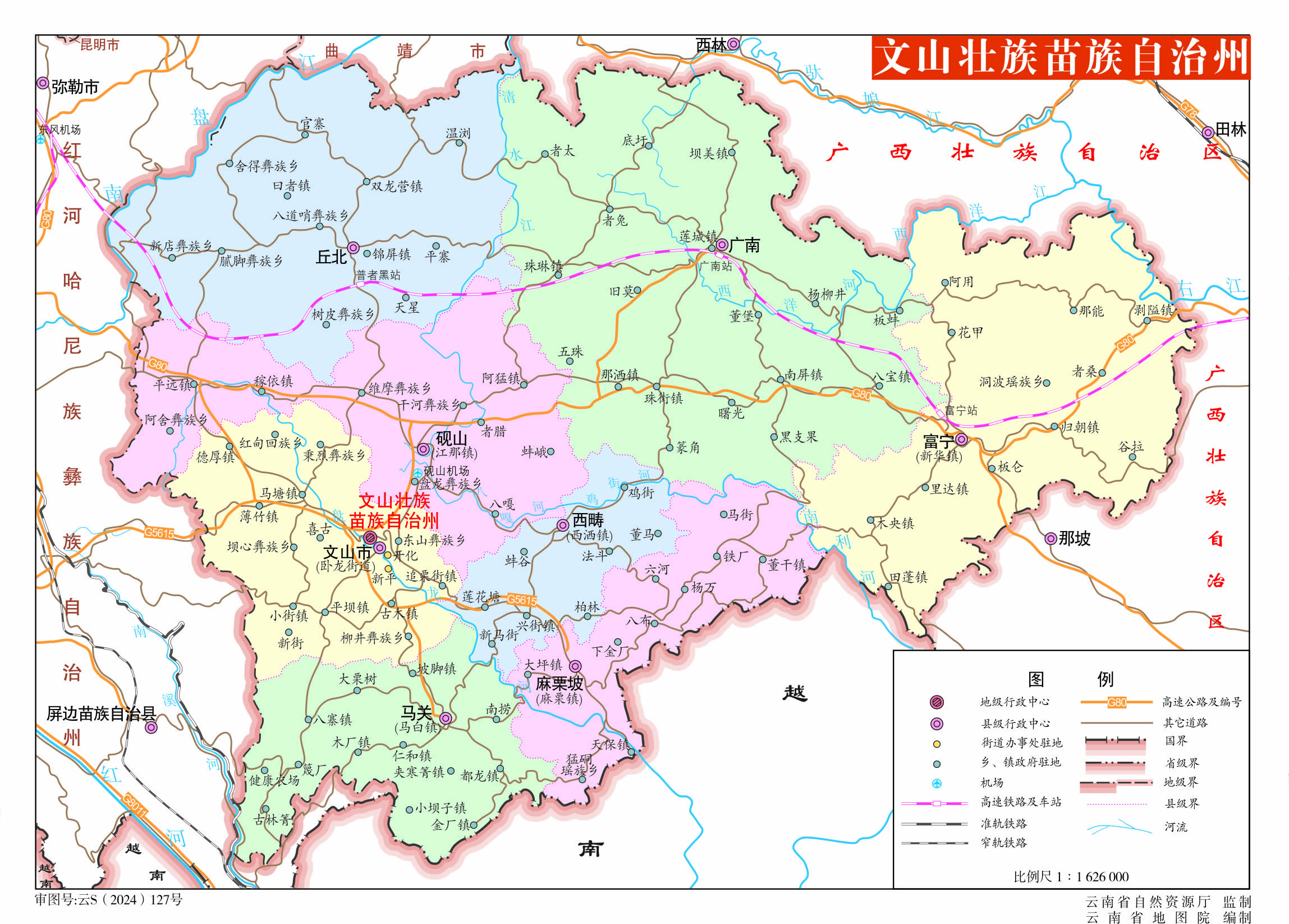 文山壯族苗族自治州轄1個(gè)縣級市、7個(gè)縣: