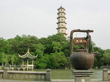 西塔始建于北宋開寶二年(969年),一說建于唐咸通十年(869年),明、清曾多次修繕。塔高32米,底徑7米,6邊形,7層,中空,系樓閣式青磚仿木構(gòu)建筑。遠遠望去,碧水藍天,全身披綠的西峰山托著磚紅色寶塔,塔剎直入云端,蔚為壯觀。就近處,江風吹動四十二個檐角的銅風鈴送聲,四周枝頭飛禽清脆的啼嗚,交響成趣。塔每層每面均有小佛龕,內(nèi)置石雕佛像,造型精致,神態(tài)自然,有頗高的藝術(shù)價值,塔周圍置青石坐凳,萬木扶疏。因塔身傾斜,曾于1982年進行大修葺。今塔仍保持宋代風格。