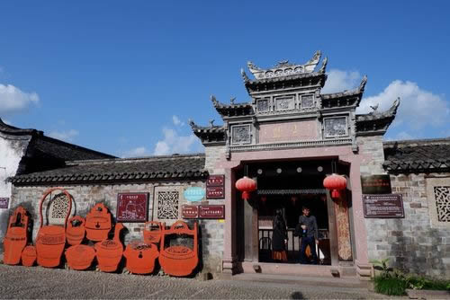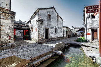 老街兩旁都是長板門面的店鋪。緊鄰老街是一幢幢至今保存完整的古建筑群,梁枋門窗上滿是雕飾,精巧的躍魚馬頭墻和脊塑墻花具有獨特的地方風格。馬頭墻是古代江南富戶官宅威勢的象征,據(jù)說級數(shù)越多,職位越高。墻面嵌著雕花石窗,外墻上塑浮雕文字,墻尖塑著沖天而起的躍魚和飛龍,寓含“鯉魚跳龍門”之意。門柱上那兩只活動的倒掛獅子,門墻上一對瓷盆中各飾有5只飛舞的蝙蝠,象征著五福臨門。大祠堂建于明洪武十八年。大廳有32根大圓柱,好比32顆象棋子,隱含全局一盤棋之意;每根柱子中間大,兩頭小,是典型的隋唐風格明式建筑。