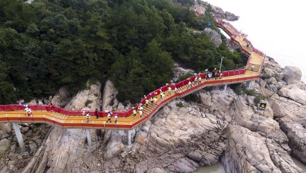 松蘭山游步道位于松蘭山沿海岸線,南起東沙灘,北至白沙灣,以棧道形式沿濱海礁石海灘穿行,全長3.1公里,平均寬度為2.5米,總面積約12萬平方米。棧道是集公眾性、休閑性、生態(tài)性為一體的高品質濱海慢行步道,沿線設置濱海眺臺、觀景平臺等,全程以紅色為主調(diào),素有“海上紅絲帶”之美譽。