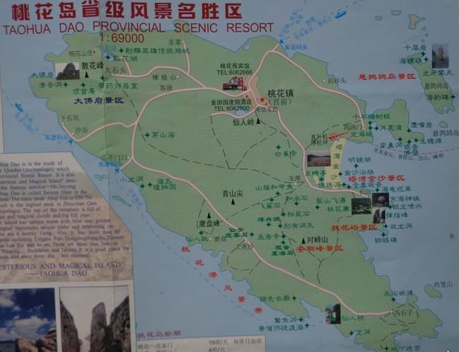 桃花島與——普陀山、“沙雕故鄉(xiāng)”——朱家尖、“十里漁港” ——沈家門組成普陀旅游金三角。 桃花島歷史悠久,宋乾道《四明國志》有證:客浦遺址考證,在商國時(shí)期就有人類活動的足跡。先秦,隱士安期生漂流至桃花島,采藥修道,開爐煉丹。嘗以醉墨灑于山石,遂呈桃花紋,奇形異狀,宛若天然,故石稱桃花石,山稱桃花山,島稱桃花島,被譽(yù)為“海上仙山”。桃花島擁有舟山千島第一高峰——安期峰,海拔539.7米;舟山第一深港——桃花港;東南沿海第一大石——大佛巖,巖體高 78米;舟山第二大沙灘——千步金沙;還是中國三大水仙名品之一的普陀水仙和浙江名茶之一的普陀佛茶的主要產(chǎn)地;又是浙江沿海島嶼中林木品種最多的島嶼,共有78科、556種,素有“海島植物園”之美譽(yù)。桃花島碧海金沙環(huán)繞、多奇峰怪石、林木蔥郁、氣候宜人、環(huán)境清幽、風(fēng)光旖旎,集山、海、沙、石、礁、巖、洞、花、林、鳥、寺、廟、庵、天象奇觀、軍事遺跡、歷史紀(jì)念地、摩崖石刻、神話傳說于一體,自然景觀與人文景觀相映成輝,相得益彰。大佛巖是桃花島的標(biāo)志,不但自然景觀獨(dú)特,而且蘊(yùn)含著豐富的武俠文化內(nèi)涵,是金庸筆下《射》書中桃花島主黃藥師的主要活動場所。大佛巖中腹的“清音洞”是先秦安期生漂流到桃花島后的第一個(gè)居室,在《射》書中是黃藥師藏《九陰真經(jīng)》和關(guān)押老頑童周伯通的石窟。安期峰以峰、石為特色,寺、洞為主體,龍、道、佛三大文化為背景,具有山清、水曲、石趣、峰奇、境幽、氣爽的特點(diǎn)。安期峰是舟山群島獨(dú)一無二的風(fēng)景,古代詩人在此留下了不少名句。安期生選此仙境長時(shí)期在此隱居,學(xué)道煉丹,直至白發(fā)蒼蒼,人稱“千歲翁”,為后人留下了寶貴的文化遺產(chǎn)。位于桃花島東海岸的桃花峪,奇巖壁立,桃花峪龍珠灘上,有一顆直徑80厘米,重約500公斤的球形石被人們稱為“東海神珠”。每當(dāng)臺風(fēng)將臨時(shí),海浪激飛散落,形成七彩長虹似龍騰躍,龍珠在龍喉里吞吐翻滾,發(fā)出隆隆回音,編織出一幅美妙神奇的“金龍吐珠”圖,被譽(yù)為“中華一絕”。形如拇指從掌中彈出,孤峰矗立、刀削斧劈、懸崖絕壁的彈指峰,是桃花龍女恩賜給桃花島鎮(zhèn)海擋風(fēng)的玉如意,也是金庸筆下桃花島主黃藥師練功習(xí)武之所。這里的海崖風(fēng)光可謂佳境。難怪600多年前元朝文學(xué)家吳萊到此游玩時(shí)寫詩贊曰:“……雕鎪鬼斧觖,刮濯龍湫移……”清代文學(xué)家朱緒來桃花島泛舟環(huán)游,寫下了《桃花山》和《桃花龍?zhí)丁吩,贊美桃花島風(fēng)光。在《桃花山》詩中還特別點(diǎn)出了觀環(huán)島景觀的感受,詩曰:“墨痕乘醉灑桃花,石上斑紋爛若霞。浪說武陵春色好,不曾來此泛仙槎。”桃花島不但具有濃郁的漁鄉(xiāng)風(fēng)情和民俗文化,而且各代不少文人墨客、旅行家來桃花島觀光、探奇、尋古、考證,從先秦的安期生第一個(gè)上島之后,漢時(shí)的大臣李少純;宋時(shí)的文學(xué)家蘇軾;元朝文學(xué)家詩人吳萊;明朝的文學(xué)家、軍事家朱丸;清朝文學(xué)家、詩人朱緒、繆燧;直到當(dāng)代武俠文學(xué)大師金庸,每一位名人都留下了與實(shí)景相結(jié)合的作品。