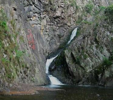 烈馬奔騰第四洩:第三級瀑布散而復收,跌入一個斜長形的深潭中,然后在高19米的陡崖中,劈險溝,過峭壁,在狹窄的之字形山溝中急劇旋轉,飛滾翻騰,奔瀉跌宕,飛濺的水花猶如奔騰中的烈馬鬃筆在飛速抖動,古人們稱其為“烈馬奔騰第四洩”。瀑布在奔騰怒吼中,匯成巨大的轟鳴聲,明文學家王思任形容其“聲怒、勢怒、色怒”,十分形象貼切,故第四洩的觀瀑亭命名為“三怒亭”。四泄由于上下都為懸崖峭壁,過去游人想見,必須攀巖扣石牽藤,冒著生命危險才能一睹芳容。