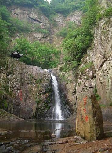月籠輕紗第一洩:水流從石河瀉下,瀑布小巧平緩,柔美如月籠輕紗,雋永奇秀,“樂聲幽咽,萬松颯然,隔岸秋花爛漫,禽聲甚樂”,瀑布中間有一水潭,直徑1.5米,口微向內收,四壁光滑,深不見底,人稱“小龍井”,俗呼小腳桶潭,是人工開鑿還是天然形成,還是一個謎,古人贊其曰:龍井鑿石灘,園勻如截竹;登波落纖埃,照見須眉綠。